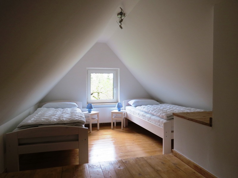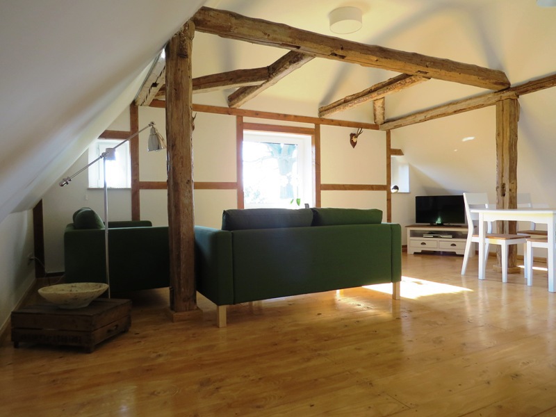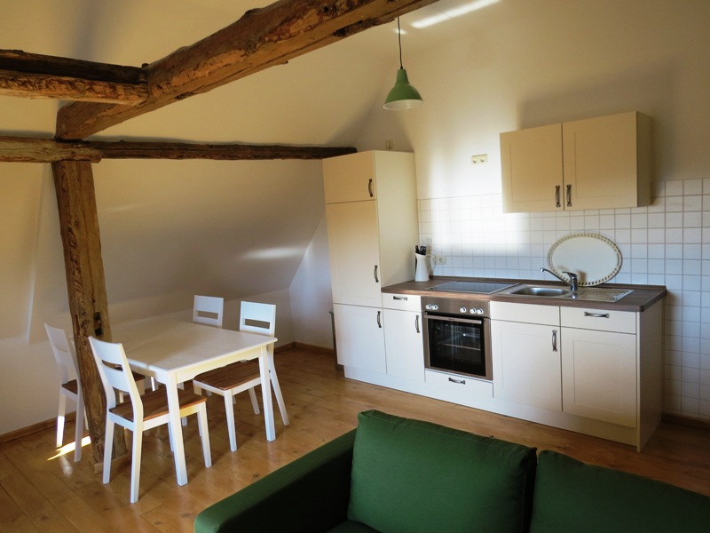Die Wohnung „Amor’s Ruh“ (4 Pers.) im DG beinhaltet 1 Wohnraum, 2 Schlafräume mit je 2 Einzelbetten, Duschbad, offene Einbauküche mit Essbereich.