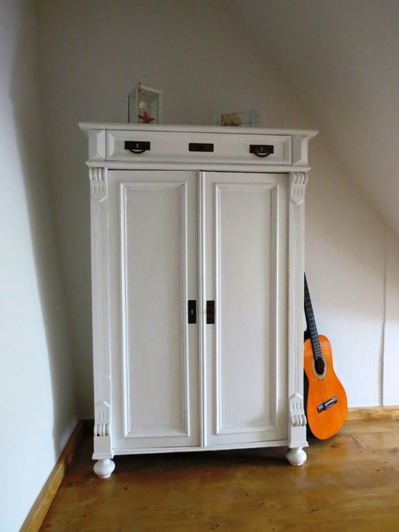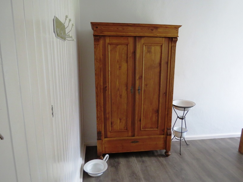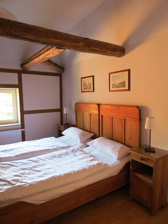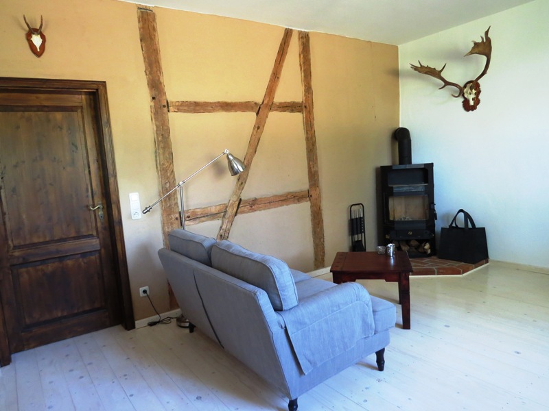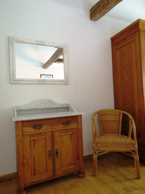 Bei der Sanierung haben wir Wert darauf gelegt, möglichst viel vom ursprünglichen Charme des Hauses zu erhalten. So schaffen die vielen freigelegten Holzbalken, die alten Böden, Esstische aus alten Türen, Garderoben aus alten Balken und auch die wieder entdeckte Lehmwand im Erdgeschoss eine harmonische Atmosphäre. Vervollständigt wird diese durch überwiegend antike Möbel, welche neben neuem Mobiliar im gesamten Haus liebevoll arrangiert wurden.