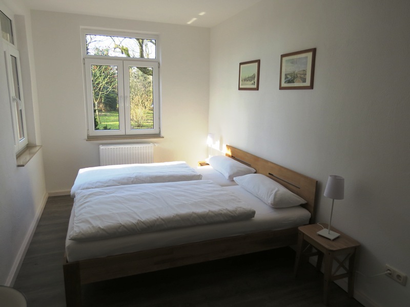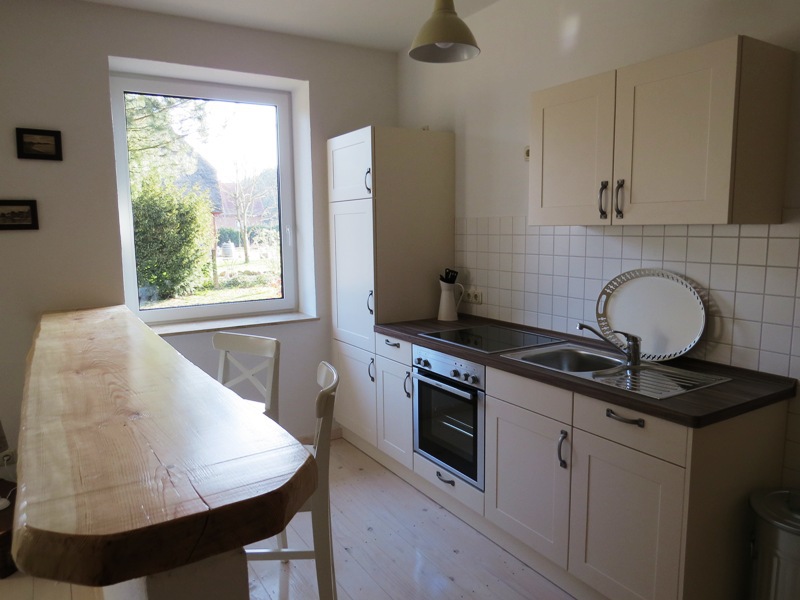 Die kleine Ferienwohnung „Schaale“ (2 Pers.) im EG verfügt über 1 Wohnraum mit Kaminofen, 1 Schlafraum mit 2 Einzelbetten, Duschbad, offene Einbauküche mit Tresen als Essbereich.