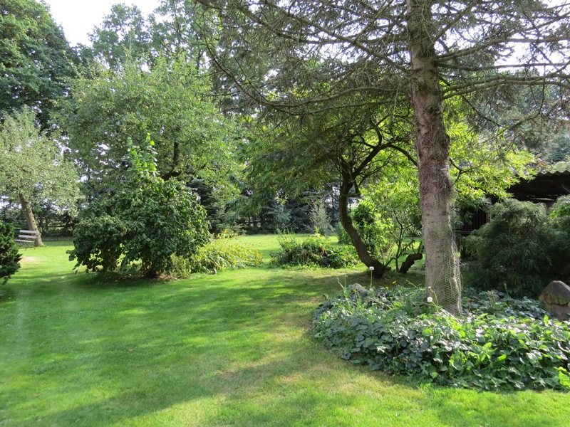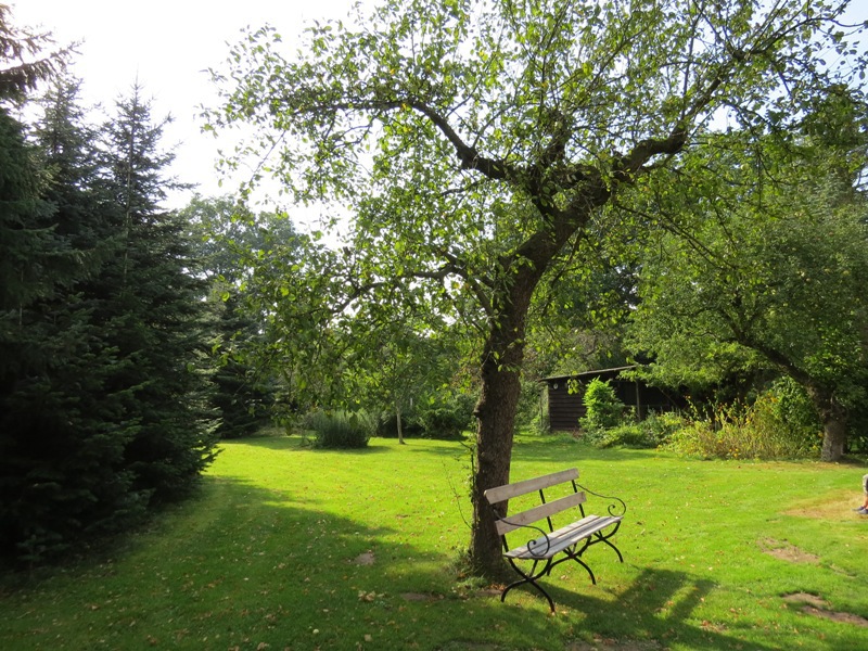 Im Garten, mit seinen alten Eichen und Obstbäumen, laden viele Sitzmöglichkeiten zum Verweilen und Entspannen oder einem gemütlichen Grillabend ein.