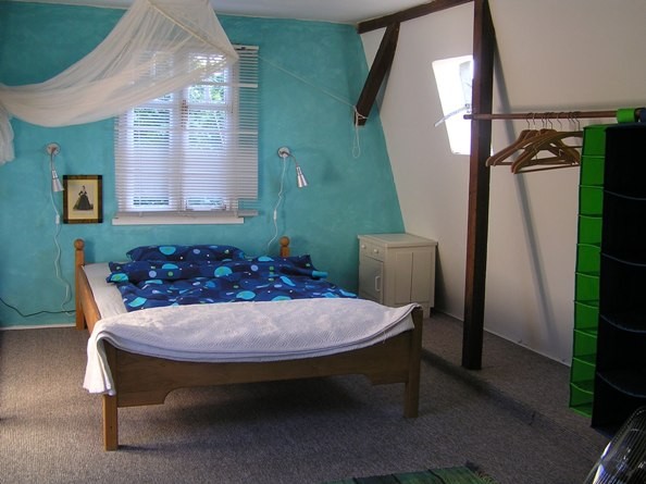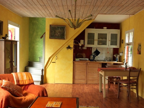 Im romantischen Holzhäuschen in unserem Obstgarten gibt es unten ein 20qm großes Wohnzimmer mit offener Küche und einen kleinen Badanbau. Unterm Dach befindet sich das etwa 18qm große Schlafzimmer mit Doppelbett mit einem wunderbaren Ausblick über die Wiesen von Rögnitz.