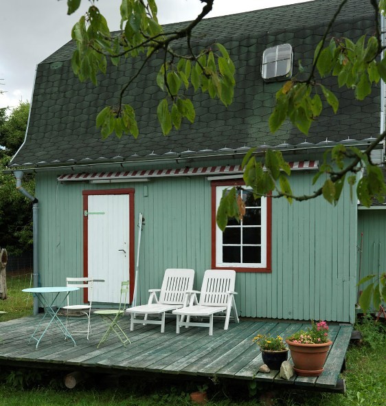 Das Häuschen liegt weitab allein im Garten und hat nach hinten eine große Terrasse mit Markise.