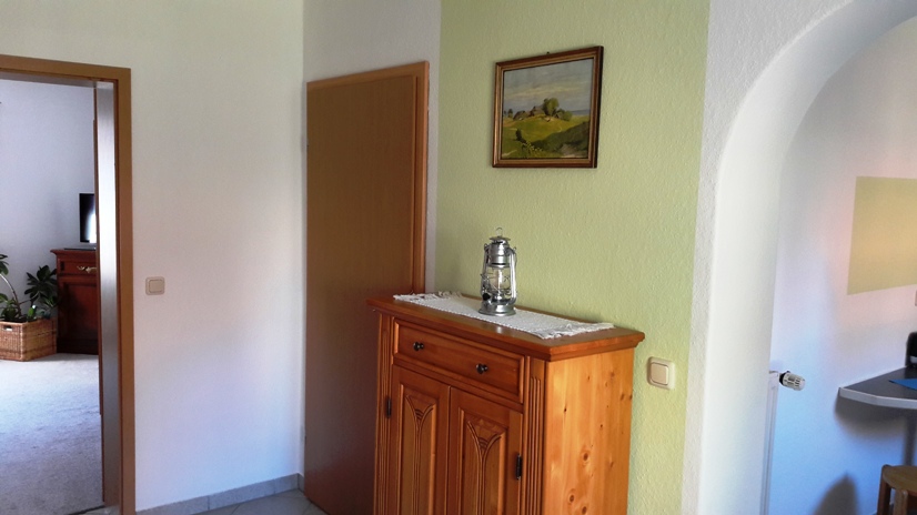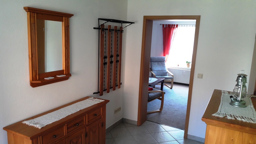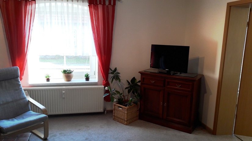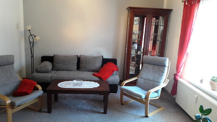 Hier sehen Sie die größere Ferienwohnung (52 m²)  im Erdgeschoß. Sie bietet Platz für 2 Personen und eine Aufbettungsmöglichkeit ( Schlafsofa ).