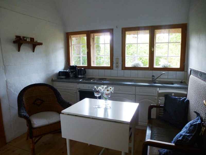 Schöne, gemütliche Ferienwohnung, ca. 45qm in einem alten, sanierten Reetdachhaus mit großem Grundstück und direktem Seezugang in Techin. Die Wohnung besteht aus Wohnzimmer, Schlafzimmer, Küche