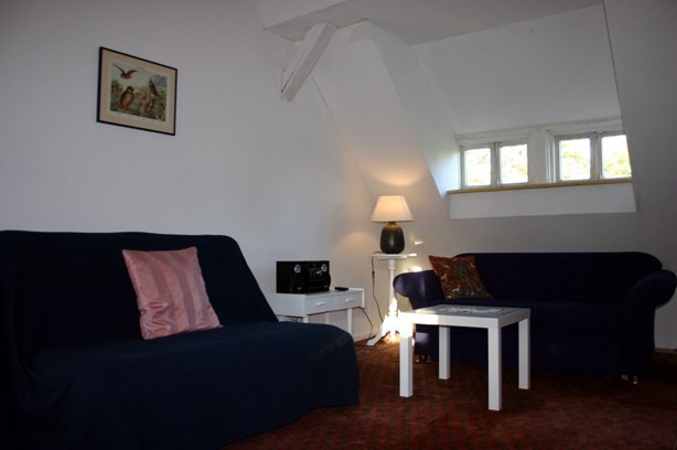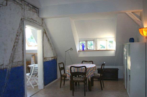 Das rund 30qm große Wohnzimmer hat im Zuge des Ausbaus einen Teil seiner früheren Charakteristik mit seinen Fachwerk-Lehmwänden behalten. Hier befinden sich ein Esstisch, ein kleiner Ofen und eine Sitzecke mit zwei Sofas, die zum Schlafen ausgeklappt werden können (Breite 1,40m bzw. 1,20 m).