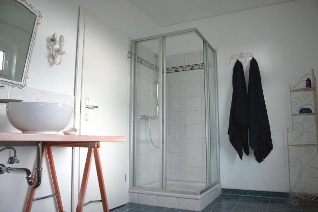 Hinter der Küche liegt das Badezimmer. Es verfügt über eine Dusche, WC und ein Waschbecken.