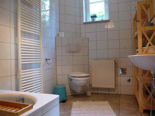 Der breite Flur bietet Platz für Jacken, Schuhwerk und Freizeitutensilien. Das große Bad verfügt über Badewanne und Dusche; das Schlafzimmer über ein großzügig bemessenes Massivholzbett.