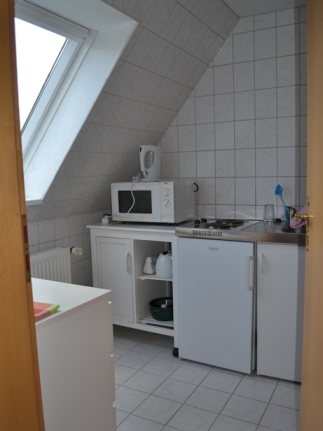 Die Küche hat eine Spüle, einen E-Herd mit Ceran-Kochfeld, sowie Wasserkocher, Kühlschrank und Toaster.
