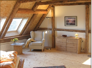 Auf dem ehemaligen Heuboden befinden sich in zwei Ebenen Wohnzimmer mit Kaminofen,